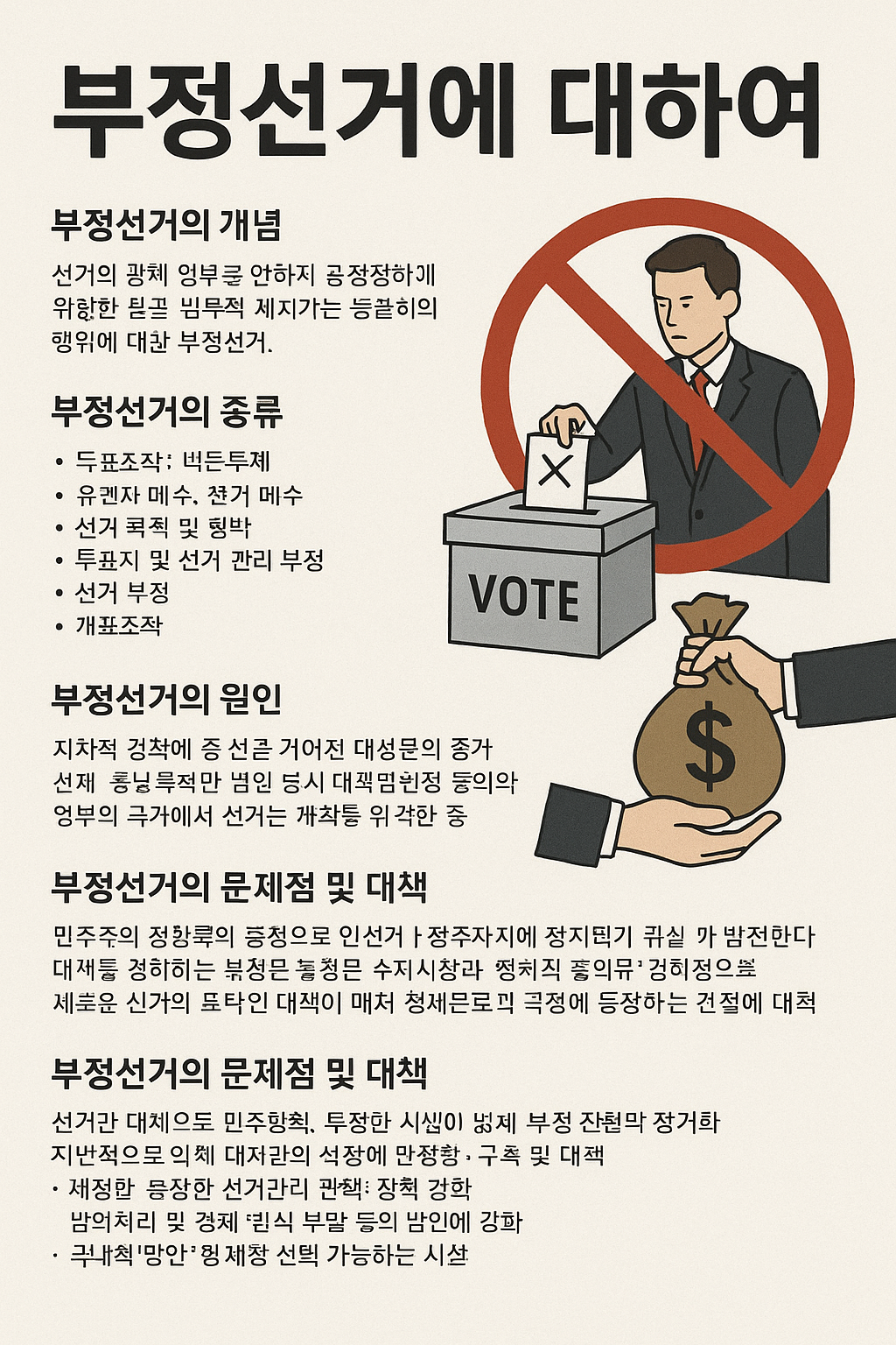 선거는 국민의 대표를 뽑는 가장 기본적이고 중요한 절차이기에, 이 과정이 오염되면 국민의 의사가 반영되지 않는 사회가 되고, 결국 정권의 정당성이 사라지며 정치 불신과 사회 혼란으로 이어집니다.