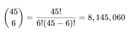 로또복권은 1부터 45까지 숫자 중 6개를 선택하는 방식이다. 이때, 조합을 계산하면 다음과 같다.