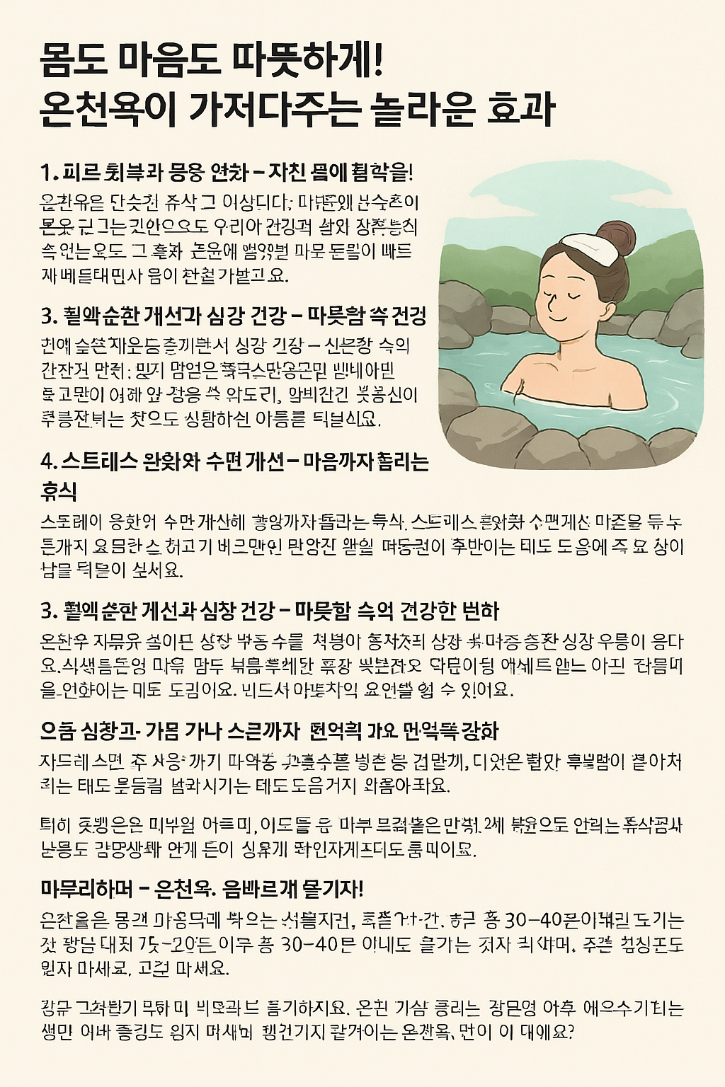 온천욕은 피로 회복, 피부 미용, 혈액순환 개선 등 다양한 건강 효과를 주며, 정신적 스트레스 완화에도 도움을 줍니다.