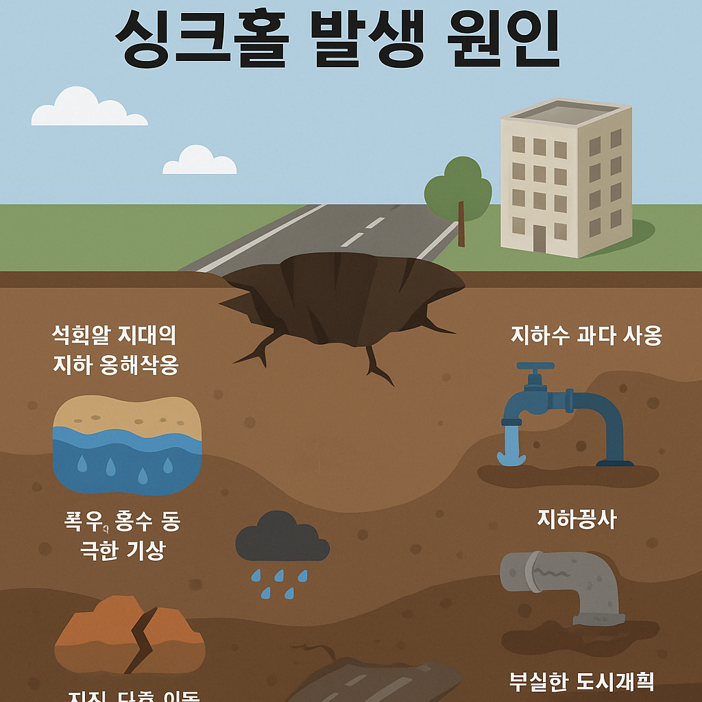 - 낙후된 하수관: 오래된 하수관이 터져서 물이 새고, 그 물이 지하를 잠식해 싱크홀을 만들기도 해요.